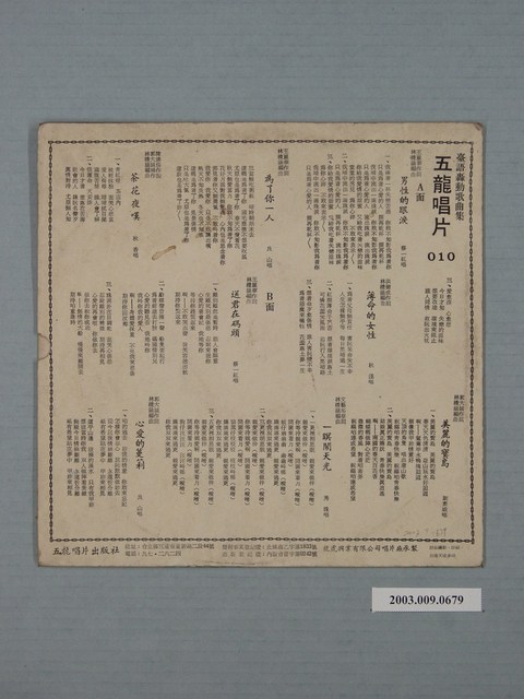五龍唱片公司出品編號「WL-010」之十吋唱片,約出版於1968年,由蔡一紅主唱,主打歌曲〈男性的眼淚〉。蔡一紅為30年代知名歌星劉金寶的女兒,自幼受歌唱訓練,出自創作歌星吳晉淮門下,1965年以電影主題曲〈冰點〉一曲成名,遊走於酒店、歌廳演出,1968年加入五龍唱片,灌錄她先前唱紅的諸多歌曲後才正式成名,在一片十多歲女歌星的歌壇裡,算是少數據深厚嗓音的女星歌手。(關於五龍唱片之成立背景,參考本館藏品編號2003.009.0601之介紹)
