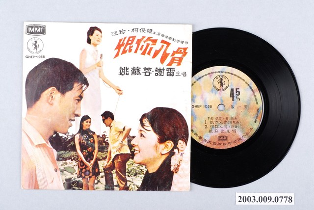 馬樂唱片工業股份有限公司(Malaysia Musical Industries Sdn. Berhad,地址:No.41 JALAN OTHMAN PETALING JAYA)出品「金馬唱片」(Golden Horse)商標「GHEP-1058」的7吋塑膠唱片。標題為《恨你入骨:謝雷、姚蘇蓉主唱》。曲目包括A面的〈恨你入骨(主題曲)〉(莊奴 詞/古月 曲)、〈恨你入骨(終曲)〉,以及B面的〈你可知道我想你〉(莊奴 詞)、〈花兒像人人像花〉。共四首國語歌曲。