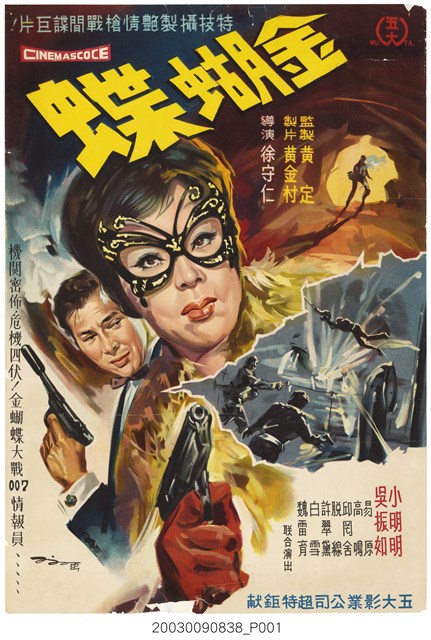 《金蝴蝶》為1967年上映的臺語諜報片,由五大影業公司出品,徐守仁導演,小明明、吳振如主演。1964-1968年間,臺灣電影界大量拍製臺語間諜片,原因可能是由於1962年臺灣上映的英國間諜片《第七號情報員》(Dr. No)的風行。本館也典藏多部同類型的臺語諜報片,包括《艷諜三盲女》、《諜報七金剛》、《第三號反間諜續集》等海報。本件與館藏登錄號2003.017.0153同款。