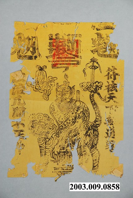本件天師鎮宅版印符令,為結合神禡所印製之鎮宅大符。符令以墨版印製於米黃色紙張之上,並加蓋朱紅色法印而成。畫面上端中央書上下相連的「勅令」兩字,並蓋上一方朱文「道經師寶」的道教三寶法印,兩側書有兩個分別由「鎮宅」、「光明」所組合而成的複文字。畫面中央為張天師像,張天師跨坐於尾巴高翹、頭朝左方的黑虎背上,雙手朝右合持一只朝笏,頭部左右分別有一方印章與一把寶劍,兩側對聯分書「符祛天下無道鬼」、「法治凡間不正神」。畫面左右及下端多處缺損。