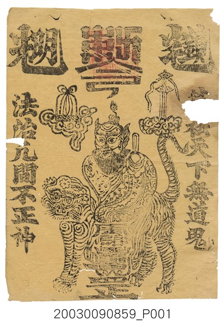 本件天師鎮宅版印符令,為結合神禡所印製之鎮宅大符。符令以墨版印製於米黃色紙張之上,並加蓋朱紅色法印而成。畫面上端中央書上下相連的「勅令」兩字,並蓋上一方朱文「道經師寶」的道教三寶法印,兩側書有兩個分別由「鎮宅」、「光明」所組合而成的複文文字。畫面中央為張天師像,張天師跨坐於尾巴高翹、頭朝左方的黑虎背上,雙手朝右合持一只朝笏,頭部左右分別有一方印章與一把寶劍,張天師兩側又有一副對聯,分書「符祛天下無道鬼」、「法治凡間不正神」,符祛兩字之間符面缺損。