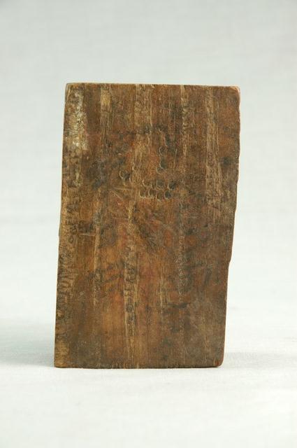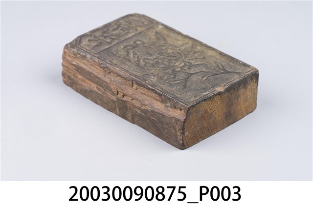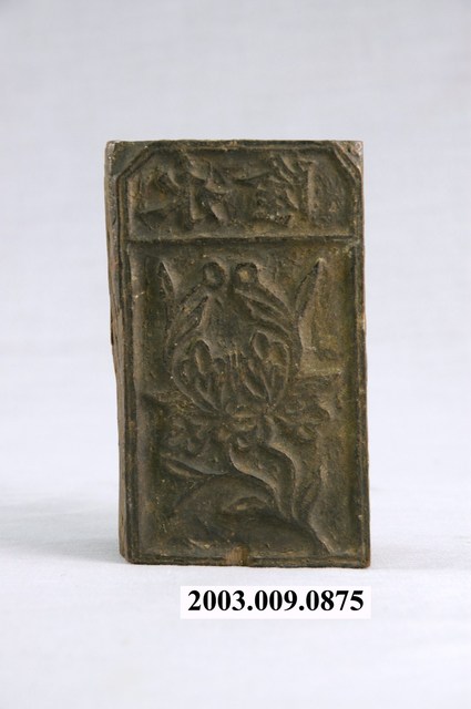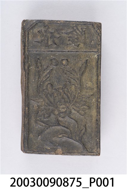 金銀紙在包裝之前,版面都會蓋上各種神祇象徵的或名稱的版印圖案。本件木刻商標印版為直式陽刻,內容為花草圖案,上方有「永隆」2字,應為店舖名稱。印版正面呈黑色,下方有1處破損,背面呈原木色,整體保存完整。