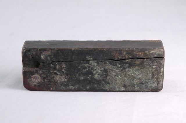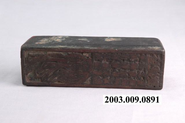 1.本物件是木製的商號印記刻版。此木刻版為長方體,背面處有裂痕,刻版面為碑型、牌匾型樣式,外框無花紋設計,框內上方有「金□□」商號文字,商號下方刻有相關說明文字,因刻版模糊難以辨讀,最下方刻有1個許多線條狀圖樣,因刻板模糊難以辨識。