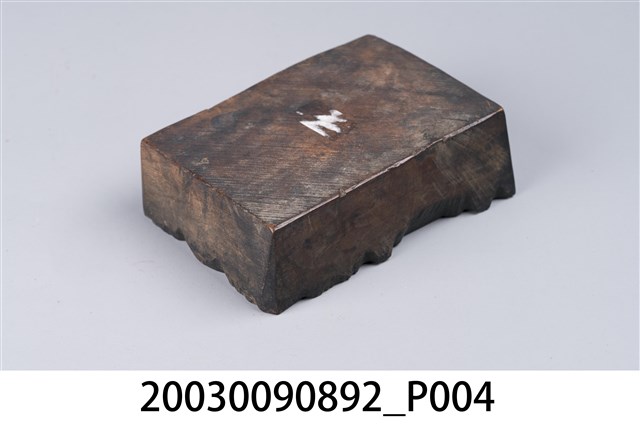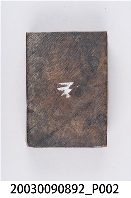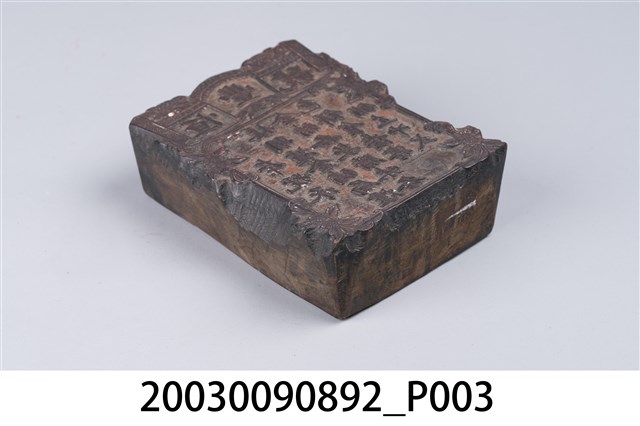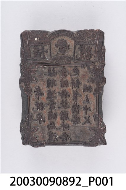 1.本物件是木製的商號印記刻版。此木刻版為長方體;刻版面為碑型、牌匾型樣式,外框以植物花草圖紋裝飾;框內上方是書卷軸設計,外圍搭配方形回字紋,刻有「恆豐號」商號文字;框內下方刻有「本號承」、「接明爐金豬局爐」、「金豬各款腊味各」、「色餅食?客」、「舖左冲式」文字。