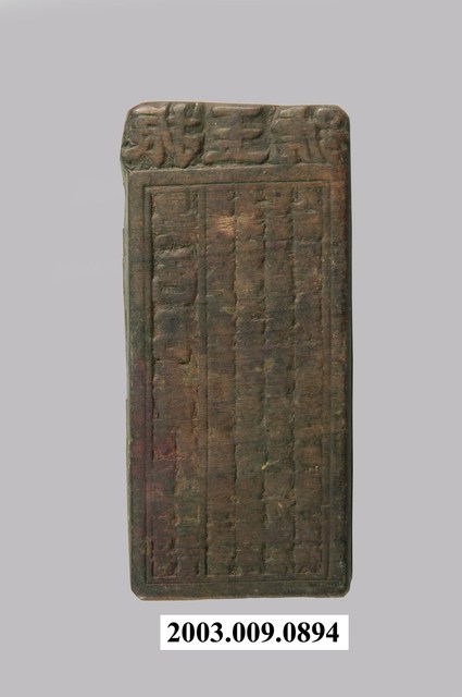 1.本物件是木製的商號印記刻版。此木刻版為長方體,刻版面為碑型、牌匾型樣式,最上方刻有「振玉號」文字,商號文字下方刻有簡單長方外框,無裝飾圖紋,框內刻有5行直書文字,因刻版磨損難以辨讀內容。