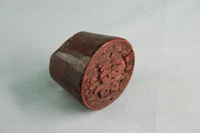 1.本物件是木製的商號印記刻版。此木刻版為圓塊狀,整體呈深紅色色澤;刻版面為圓形,中央有1道裂痕;刻版面的圓框以回形紋裝飾,框內僅刻單一文字「囍」。