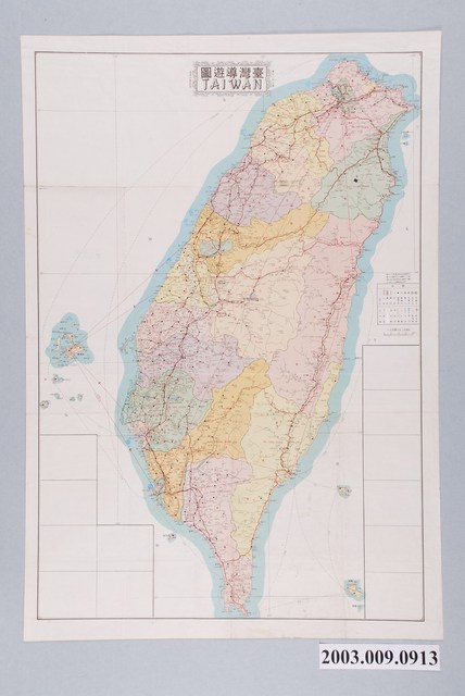 本件〈臺灣導遊圖〉,比例尺五十萬分一,彩圖,方萬福編著,中榮書局發行,圖名外還有「實行三民主義、復興中華民族」標語。背面蓋有「複審樣本 」印戳,屬複審版本。可與館藏號2003.009.0909之初審版本相參照。