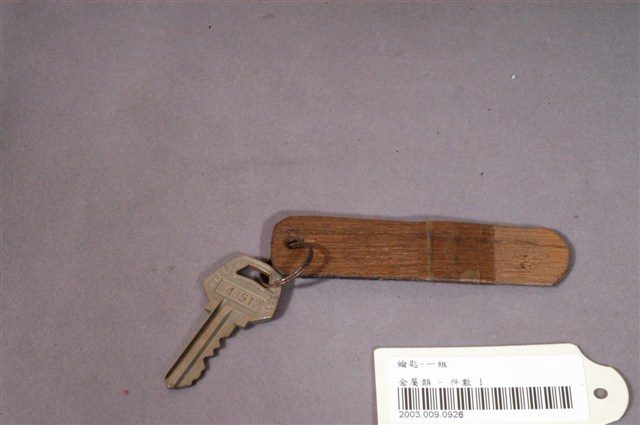 1.本件為彈子鎖之鑰匙,屬於「彈子鎖」,原理是使用多個不同高度的圓柱形零件,鎖住鎖芯。當放入正確的鑰匙,各鎖簧被推至相同的高度,便能轉開鎖芯。鑰匙上印有「B43512」編號,鑰匙附有無字樣木片掛牌。2.彈子鎖是老奈納斯‧耶魯(Linus Yale, Sr.)發明於1848年,之後他的兒子小奈納斯‧耶魯(Linus Yale, Jr)將其改良。