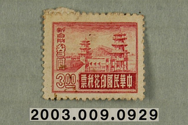 1.本物件為中華民國印花稅票,四方形稅票四周以花邊呈現,中間圖案以紅色為主,稅票圖案為雙塔,左邊寫有代表價值「新臺幣参元」,最下方寫有「中華民國印花稅票」。不同時期的稅票有不同圖案,記錄中華民國不同的風景。