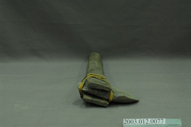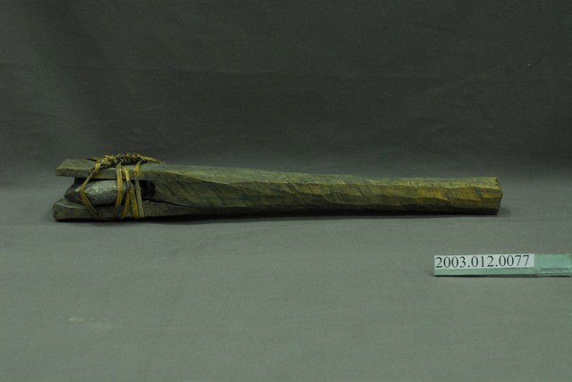 1. 達悟族石斧,木質長柄,柄頭粗大,近頂端雕鑿成一狹長溝槽(側面觀之近似Y字形),便於將斧刃插入固定。斧刃以安山岩通體打製而成,近柄部較窄,刃部較寬,另以籐篾交錯綁縛將木柄與石斧固定。石質為早期鐵器尚未引入蘭嶼島內之主要工具製作材料,打製石斧多用作劈砍用之農具或木工工具。