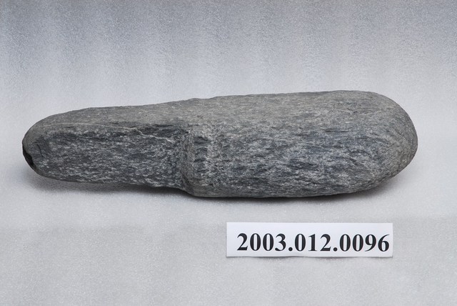 2. 本件石杵顏色呈灰黑色,石材推測為片岩材質,製作方式係以打製與啄製。外型呈長條狀,上半段較細長,剖面扁平,為連接木桿之柄部,下半段圓胖,為擊打的用部,上下交界處帶一明顯的突脊。