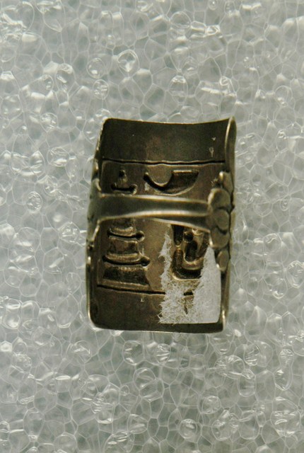 本文物為寶塔金屬戒指,上面刻有一名書生走向寶塔之貌。臺灣原住民及漢人皆會帶配飾,而就漢人而言女性使用飾品的比率比男性高。傳統社會中女性配戴的首飾,代表家族的財富及地位,尤其在嫁娶之時,以金銀飾品作為聘禮也十分常見。在臺灣貧者在嫁娶至少要有銀簪,而富者並無限制。因此,飾品不但反映當時社會的審美觀,也是女性及其背後家族之社會地位之象徵。