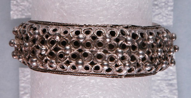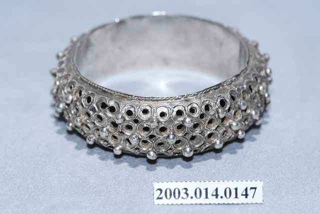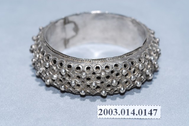 本文物為金屬鑲珠手鐲,其有一開關可能為穿戴方便設計,整體顏色偏銀色,上方刻以圓形凹孔,鑲金屬珠。臺灣原住民及漢人皆會帶配飾,而就漢人而言女性使用飾品的比率比男性高。傳統社會中女性配戴的首飾,代表家族的財富及地位,尤其在嫁娶之時,以金銀飾品作為聘禮也十分常見。在臺灣貧者在嫁娶至少要有銀簪,而富者並無限制。因此,飾品不但反映當時社會的審美觀,也是女性及其背後家族之社會地位之象徵。