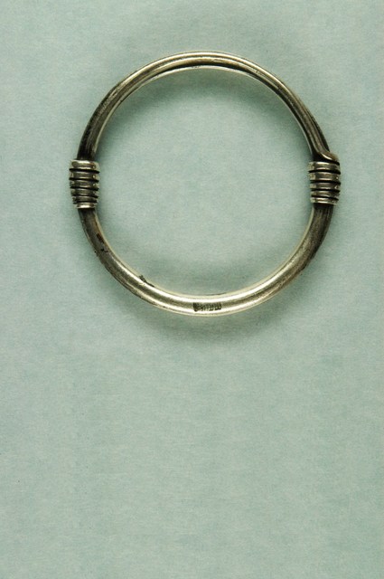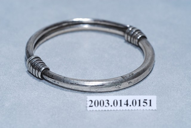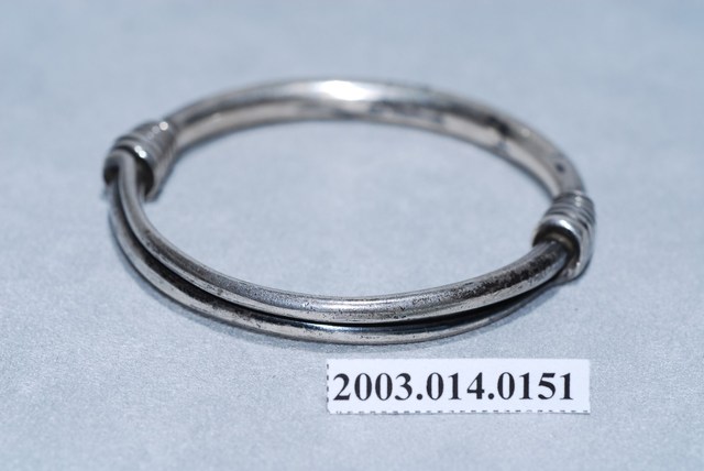 本文物為雙環金屬手鐲,兩側各有四個鐵環作為裝飾。臺灣原住民及漢人皆會帶配飾,而就漢人而言女性使用飾品的比率比男性高。傳統社會中女性配戴的首飾,代表家族的財富及地位,尤其在嫁娶之時,以金銀飾品作為聘禮也十分常見。在臺灣貧者在嫁娶至少要有銀簪,而富者並無限制。因此,飾品不但反映當時社會的審美觀,也是女性及其背後家族之社會地位之象徵。