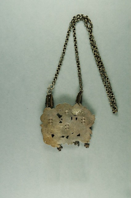 本文物麒麟送子金屬項鍊,頭綁有一髮髻童子坐在麒麟身上,麒麟配有刺繡的鞍,該鍊墜有兩側連接金屬鍊以供使用者穿戴。臺灣原住民及漢人皆會帶配飾,而就漢人而言女性使用飾品的比率比男性高。傳統社會中女性配戴的首飾,代表家族的財富及地位,尤其在嫁娶之時,以金銀飾品作為聘禮也十分常見。在臺灣貧者在嫁娶至少要有銀簪,而富者並無限制。因此,飾品不但反映當時社會的審美觀,也是女性及其背後家族之社會地位之象徵。