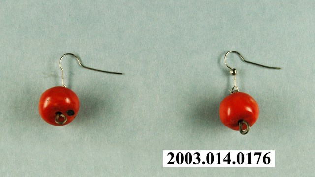 本文物為珊瑚耳飾1對,左右最上方皆有一耳勾,最下方為紅色珊瑚珠。臺灣原住民及漢人皆會帶配飾,而就漢人而言女性使用飾品的比率比男性高。傳統社會中女性配戴的首飾,代表家族的財富及地位,尤其在嫁娶之時,以金銀飾品作為聘禮也十分常見。在臺灣貧者在嫁娶至少要有銀簪,而富者並無限制。因此,飾品不但反映當時社會的審美觀,也是女性及其背後家族之社會地位之象徵。