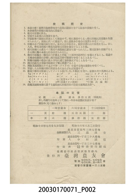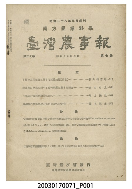 1.本物件為1941年發行的《臺灣農事報》第37年第7號刊物。封面上半部由上而下依序橫印「明治三十八年五月創刊」、「南方農業科學」、「臺灣農事報」、「第三七年 昭和十六年七月 第七號」等4排刊名及出版卷次;封面中央為目錄;封面下方橫印「臺灣農友會發行」、「臺灣總督府農業試驗所構內」兩排字樣。內文分為3大部分,首先是4篇報導及論文;其次是5則抄錄;最末是兩則雜錄。內文之後,刊載1頁篇幅之投稿規定、刊物定價及出版資料。封底印上英文版之刊名及卷次資料、目錄及發行資料。
