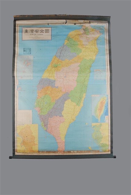 〈臺灣省全圖〉,捲軸掛圖,比例尺二十六萬分一,金蘋企業有限公司製作,1984年發行。 繪製範圍為臺灣、澎湖及附屬島嶼,功能分類為行政區域圖。內容以縣市分別套色,分為2直轄市、5省轄市、16縣。有鐵、公路等資訊。無地形描繪,有經緯度,地圖方向指北。附圖為澎湖、釣魚臺、臺灣地形、臺北市、高雄市。
