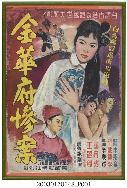 《金華府慘案》為1960年「美都影業社」發行的古裝文藝片,由戴傳李製片,李泉溪執導,華月秀、王麗卿主演,麗聲歌劇團全班人馬演出;海報上另搭配文案「台語古裝哀艷警世大悲劇!」、「台灣攝製最成功鉅鑄!」等字樣。