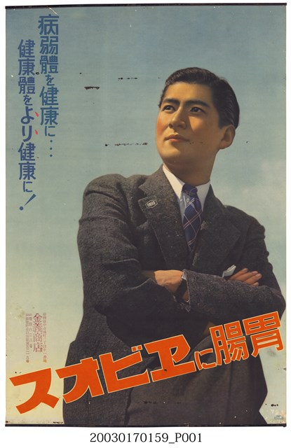 本物件為一張胃藥海報,左上角文字「病弱體を健康に… 健康體をより健康に!」意即「讓病體變得健康,讓健康的身體變得更健康」。左下角寫有其販售點金義商店,位於臺灣臺中市橘町二丁目十一番地。海報背景為一名男子雙手交叉於胸前,自信看向遠方貌。