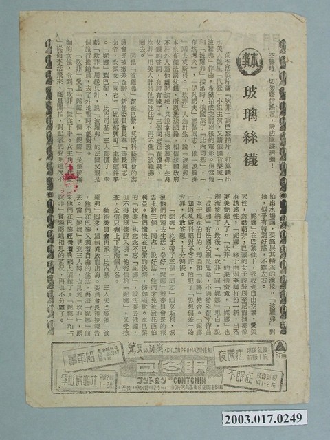 一面主要是魯本馬莫連(Rouben Mamoulian)導演的美國音樂片《玻璃絲襪》(Silk Stockings, 1957)的本事,側邊加註文字「空襲時,切勿聽信謠言,嚴防匪諜活動!」,下方有武田製藥「可冬眠」藥品廣告。
