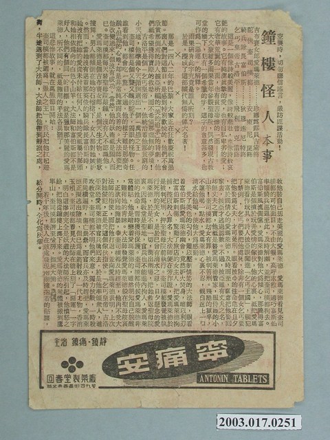 一面是黑字印刷、尚德蘭尼(Jean Delannoy)導演的法國片《鐘樓怪人》(The Hunchback of Notre Dame, 1956)本事,側邊加註文字「空襲時,切勿聽信謠言,嚴防匪諜活動!」,該片由知名女星珍娜露露布里姬(Gina Lollobrigida)主演。