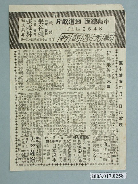 臺中戲院早期提供觀眾的電影本事,雙面單色印刷。