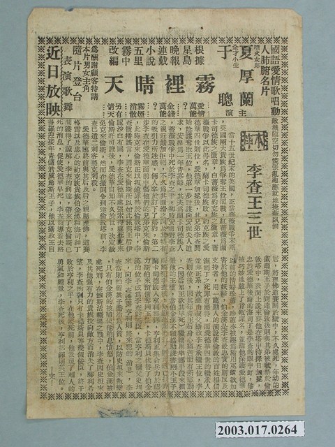一面為勞倫斯奧利爾(Laurence Olivier)導演、改編自莎士比亞劇本的英國片《李查王三世》(Richard III , 1955)本事,側邊並標註警語:「敵機臨空切勿慌張亂跑應就地掩蔽臥倒」,上方為于聰導演的香港片《霧裡情天》(1957)的下期放映廣告,由夏厚蘭及于聰主演,片名誤植為「霧裡晴天」。
