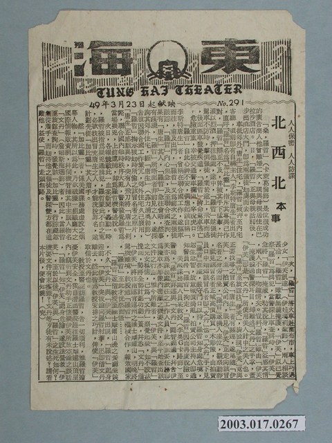臺中東海戲院1960年提供觀眾的第291期電影本事,雙面單色印刷。