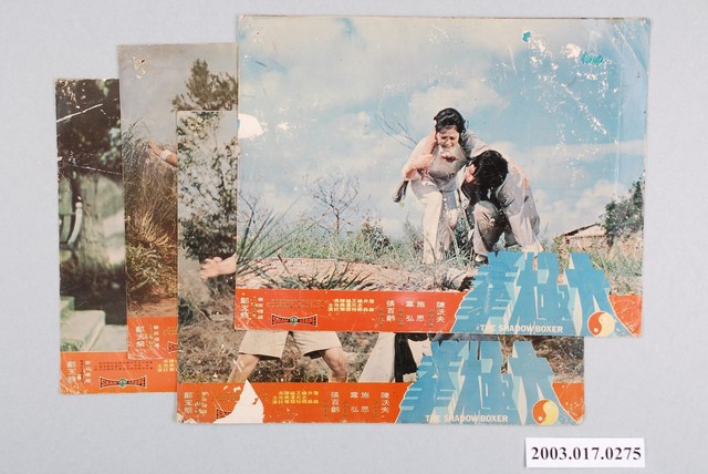 1.香港電影《太極拳》香港上映中文橫式宣傳劇照組,共4張上下並置。每一張版面皆以片中武打場景為主體。每張版面下方皆留一小塊紅色區塊列出演職員表,右下角是藍色立體片名標準字,標準字上半與劇照相疊,4張劇照狀況皆有一些毀損,表面斑駁,也有明顯的摺痕。2.《太極拳》於1974年由香港邵氏兄弟有限公司出品,鮑學禮導演、 倪匡編劇、陳沃夫、張百齡主演,拳術指導為鄭天熊、袁大熊(原名:袁和平),此部電影為第一部以太極拳為題材的電影,一反太極拳只為強身健體的認知。