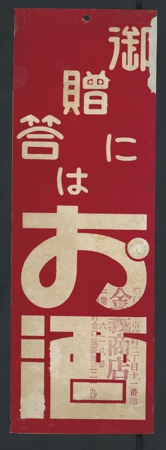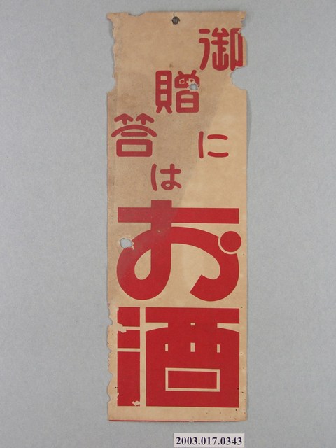 1.本物件是酒廣告牌1個。廣告牌為長方形,上方有可穿線懸掛圓孔;廣告牌正面為紅底,印有白字「御贈答にはお酒」,右下方蓋有紅色戳章:「臺灣臺中市橘町二丁目十一番地」、「金義商店」「電話六二八番」、「振替貯金口座臺灣五二一九番」;廣告牌背面為白底,印有紅字「御贈答にはお酒」。