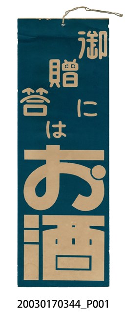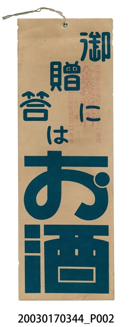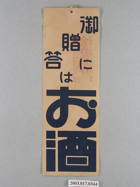 1.本物件是酒廣告牌1個。廣告牌為長方形,上方有可穿線懸掛圓孔;廣告牌正面為黑底,印有白字「御贈答にはお酒」;廣告牌背面為白底,印有黑字「御贈答にはお酒」,右上方蓋有紅色戳章:「臺灣臺中市橘町二丁目十一番地」、「金義商店」「電話六二八番」、「振替貯金口座臺灣五二一九番」。