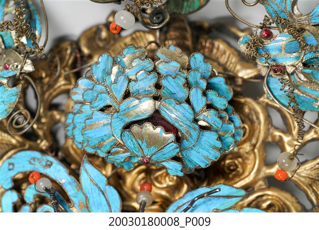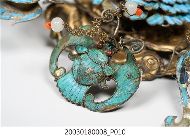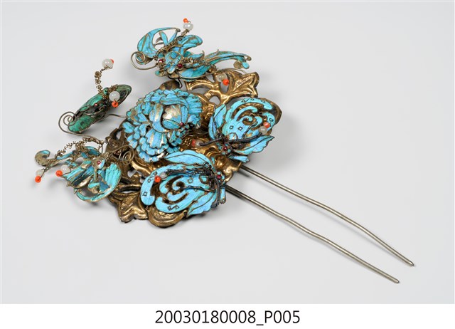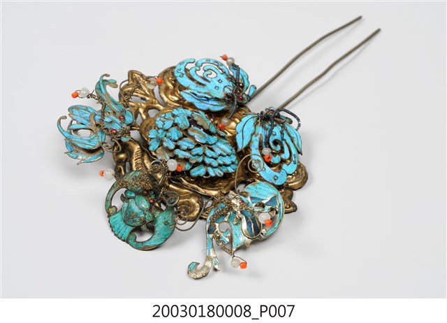 本文物為鳳凰蝴蝶雙燕翠羽釵,上方正面為以金色金屬為底並塗上藍色顏料之鳳凰、燕子、蝴蝶,其中鳳凰位置在中間,左右兩邊皆有對稱的燕子,鳳凰裝飾之下為對稱兩隻蝴蝶。惟鳳凰左上角有一綠色為主體顏色的蝙蝠裝飾。所以裝飾皆以金線勾勒其造型。背面無裝飾,裝飾部件下方為可插入頭髮的二股細長金屬。臺灣原住民及漢人皆會帶配飾,而就漢人而言女性使用飾品的比率比男性高。傳統社會中女性配戴的首飾,代表家族的財富及地位,尤其在嫁娶之時,以金銀飾品作為聘禮也十分常見。在臺灣貧者在嫁娶至少要有銀簪,而富者並無限制。因此,飾品不但反映當時社會的審美觀,也是女性及其背後家族之社會地位之象徵。