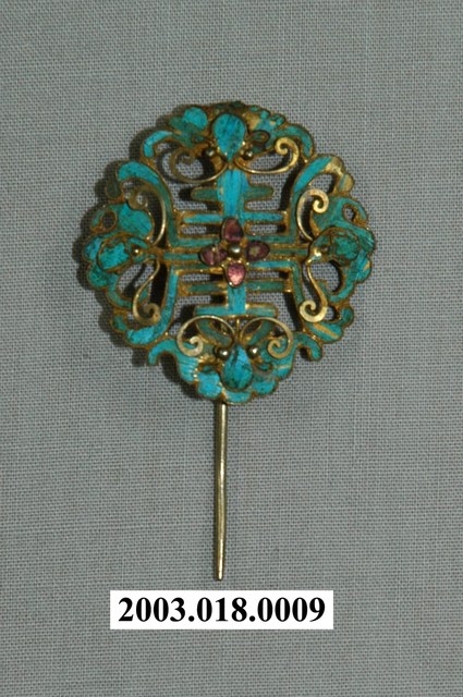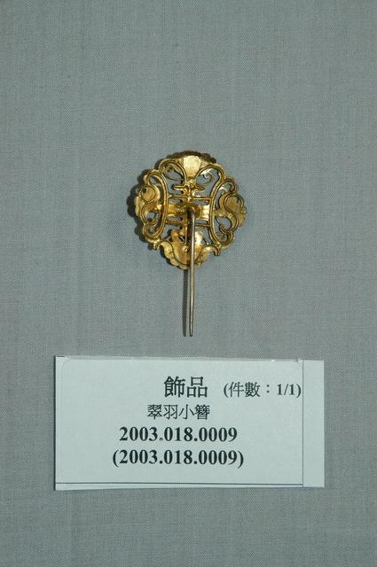 本文物為四蝶翠羽小簪,上方正面為以金色金屬為底並塗上藍色顏料之蝴蝶共四隻,其圍繞成一個圓,中間有一朵盛開的花,其以粉紅色珠子為基底裝飾。花朵部分皆以金線勾勒其造型。裝飾部件下方為可插入頭髮的一股金屬。背面為金色,無裝飾。臺灣原住民及漢人皆會帶配飾,而就漢人而言女性使用飾品的比率比男性高。傳統社會中女性配戴的首飾,代表家族的財富及地位,尤其在嫁娶之時,以金銀飾品作為聘禮也十分常見。在臺灣貧者在嫁娶至少要有銀簪,而富者並無限制。因此,飾品不但反映當時社會的審美觀,也是女性及其背後家族之社會地位之象徵。