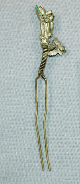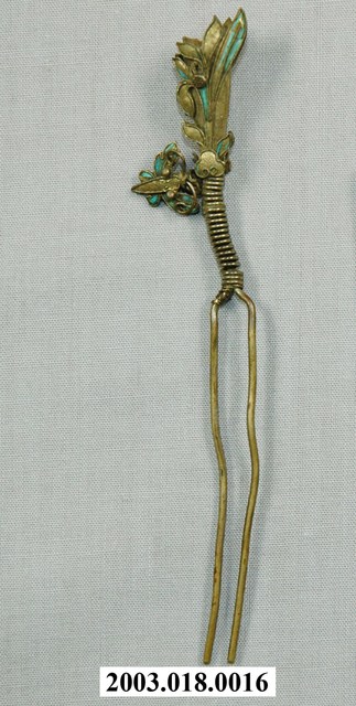 本文物為蝴蝶花朵鎏金髮釵,為以金色金屬為底並塗上藍色顏料之花朵,其中花朵左邊有一隻蝴蝶。全部皆以裝飾皆以金線勾勒其造型。背面無裝飾,裝飾部件下方為可插入頭髮的二股細長金屬。臺灣原住民及漢人皆會帶配飾,而就漢人而言女性使用飾品的比率比男性高。傳統社會中女性配戴的首飾,代表家族的財富及地位,尤其在嫁娶之時,以金銀飾品作為聘禮也十分常見。在臺灣貧者在嫁娶至少要有銀簪,而富者並無限制。因此,飾品不但反映當時社會的審美觀,也是女性及其背後家族之社會地位之象徵。