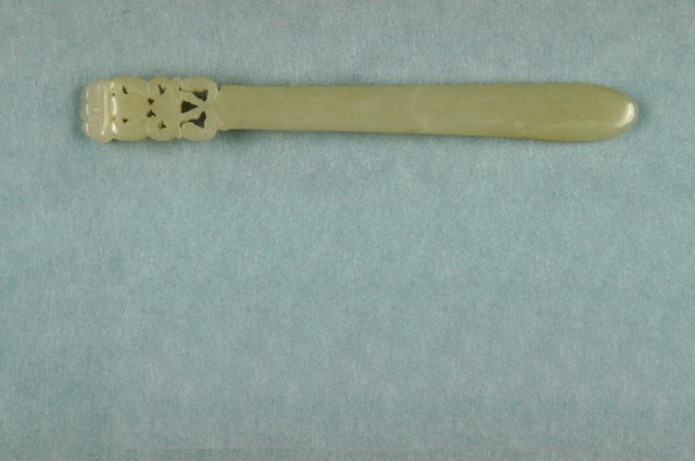 本文物為雕花白玉簪,為白色基底參雜部分綠色花紋,並以雕花裝飾,為一體成形之可插入頭髮的一股細長扁形玉。臺灣原住民及漢人皆會帶配飾,而就漢人而言女性使用飾品的比率比男性高。傳統社會中女性配戴的首飾,代表家族的財富及地位,尤其在嫁娶之時,以金銀飾品作為聘禮也十分常見。在臺灣貧者在嫁娶至少要有銀簪,而富者並無限制。因此,飾品不但反映當時社會的審美觀,也是女性及其背後家族之社會地位之象徵。