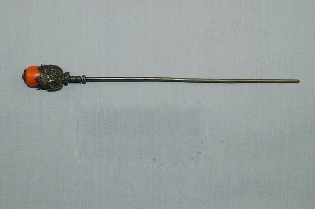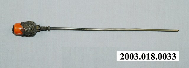 本文物為珊瑚金屬簪,其上以橘紅色珊瑚為裝飾,裝飾部件下方為可插入頭髮的一股細長的金屬,中間連接珊瑚的部分有花萼金屬雕飾。臺灣原住民及漢人皆會帶配飾,而就漢人而言女性使用飾品的比率比男性高。傳統社會中女性配戴的首飾,代表家族的財富及地位,尤其在嫁娶之時,以金銀飾品作為聘禮也十分常見。在臺灣貧者在嫁娶至少要有銀簪,而富者並無限制。因此,飾品不但反映當時社會的審美觀,也是女性及其背後家族之社會地位之象徵。