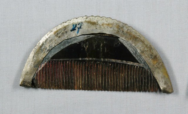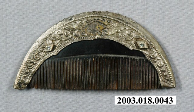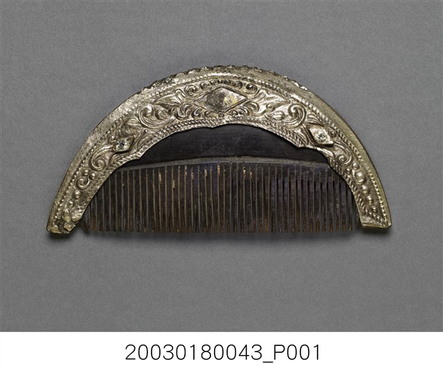 本文物為半圓形髮梳,整題而言為半圓形,上方為銀色金屬雕花裝飾,下方為梳子。臺灣原住民及漢人皆會帶配飾,而就漢人而言女性使用飾品的比率比男性高。傳統社會中女性配戴的首飾,代表家族的財富及地位,尤其在嫁娶之時,以金銀飾品作為聘禮也十分常見。因此,飾品不但反映當時社會的審美觀,也是女性及其背後家族之社會地位之象徵。