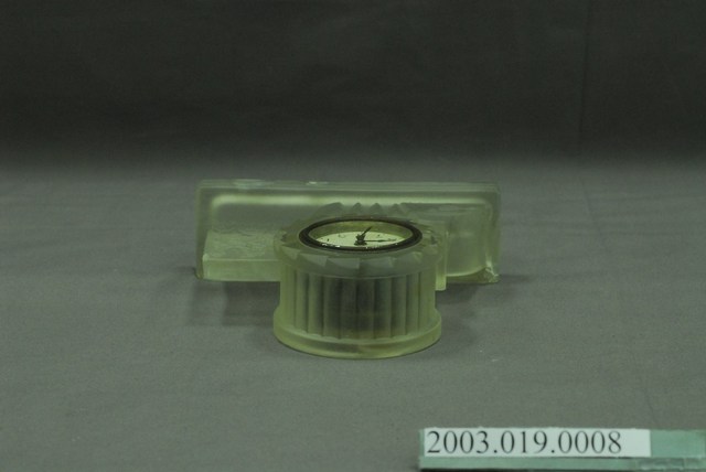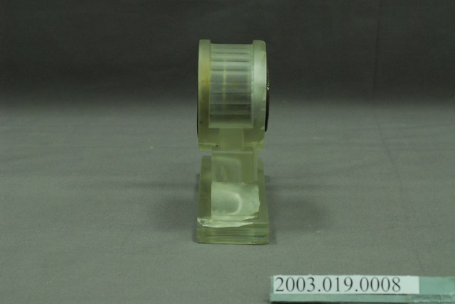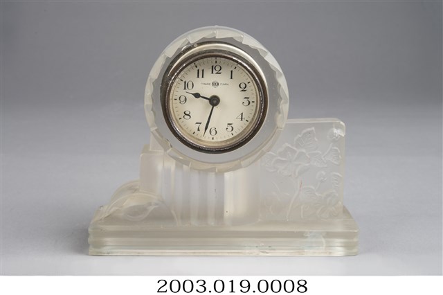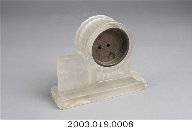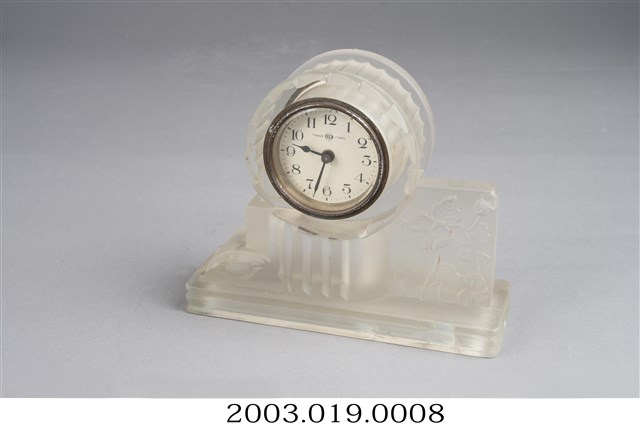 桌鐘主要放置於櫃體或桌面之上,除了用來顯示時間之外,也可作擺飾之用。本件無色透明磨砂玻璃桌鐘,以玻璃灌模製作而成,並於表面施用磨砂工法,使表面呈現霧白色。桌鐘外型於長方形寬扁底座,上作長方形造型立面,右側帶有翻模花葉圖案,立面偏左側上接中空圓筒型,為機芯與文字板的嵌入處。文字板呈圓形,外罩透明圓形玻璃,時間以阿拉伯數字1至12顯示。數字12下方印有商標,以2道同心圓環內有黑底白字之「OK」字樣,商標左右側則有「TRADE MARK」字樣。