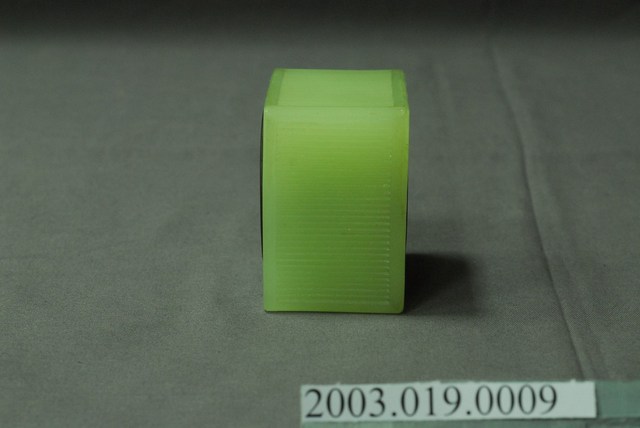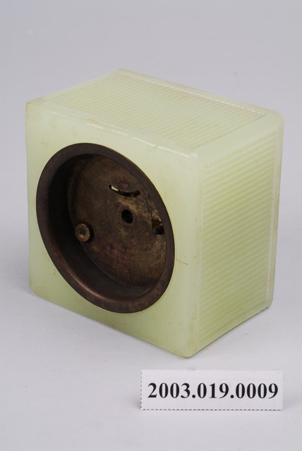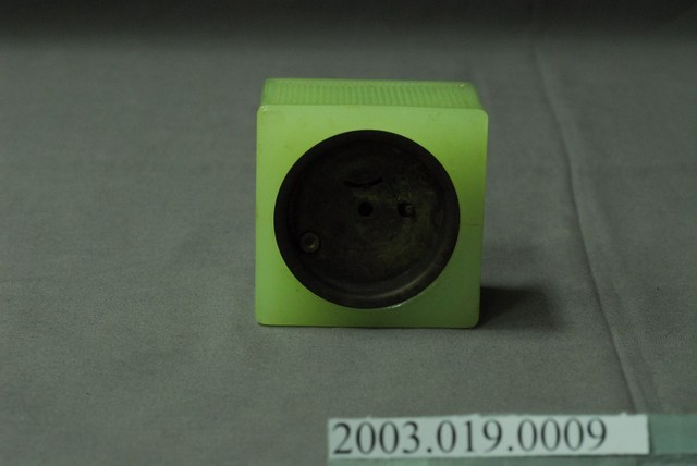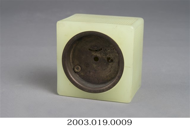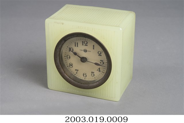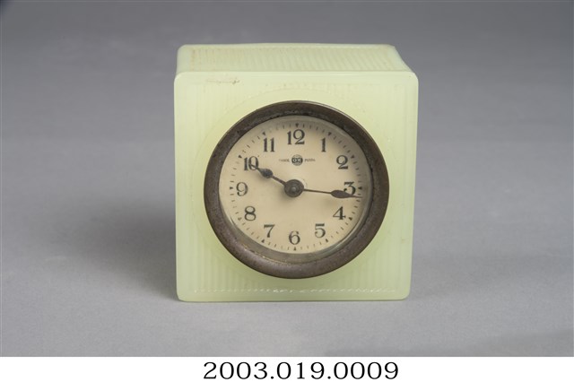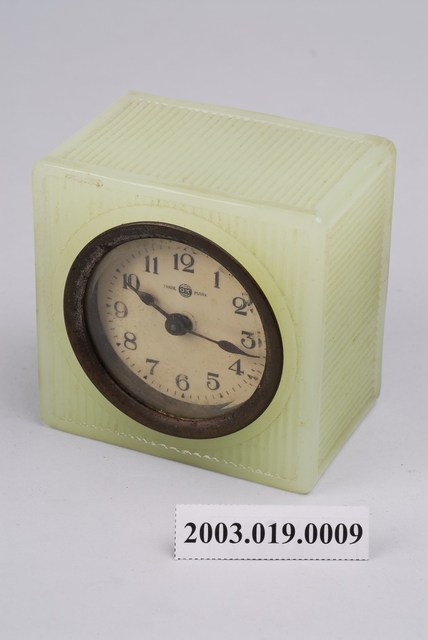 本件青白色不透明玻璃方形桌鐘,以玻璃灌模製作而成,外型呈現扁狀的正方體,正面中心為圓形中空,作嵌入文字板與機芯處。桌鐘除背面與底面之外,皆以直線紋路裝飾表面。正面之文字板呈圓形,外罩透明圓形玻璃,時間以阿拉伯數字1至12顯示。數字12下方印有商標,以2道同心圓環內有黑底白字之「OK」字樣,商標左右側則有「TRADE MARK」字樣。