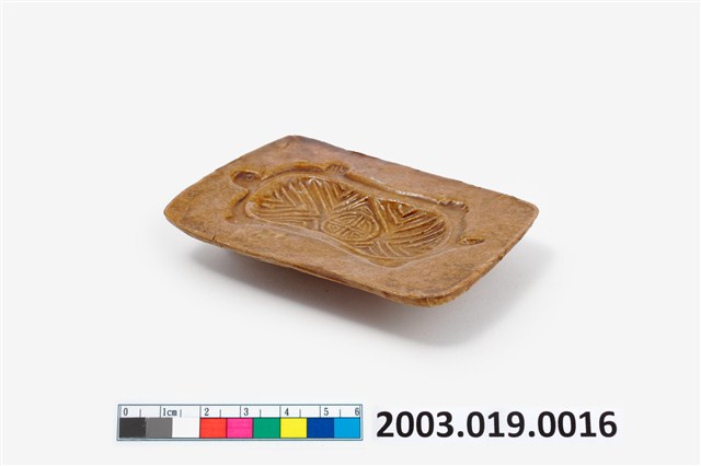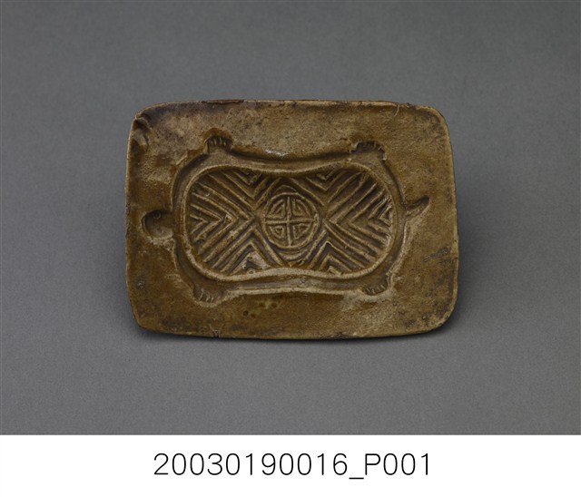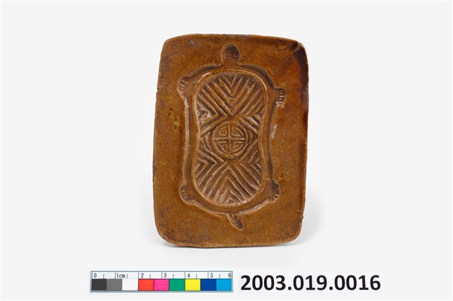 1. 陶燒長方形單面雕壽龜紋帶鈕粿印。印模面上黃褐色釉,陰雕一龜紋,龜甲較長方,雕斜紋,中央圓框內雕刻一變體壽字。背面無上釉,中央帶一短圓柱形握鈕,便於壓印操作。 2. 陶粿印模是以陶土加釉高溫燒製而成,其特點為不上油時也不容易沾黏,陶質的印模較為少見,大多數仍以木質為主。