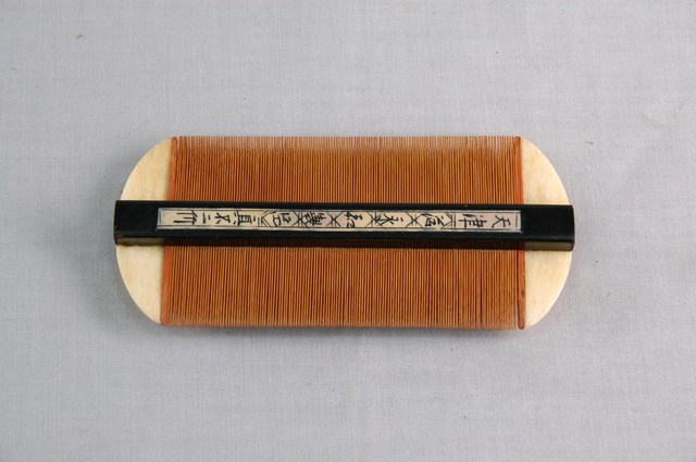 1. 天津慈永和竹篦,中間有木質樑,樑的左右兩側有竹篾製成的密齒,樑的上下兩端有牛骨製薄片擋子,樑正面有刀鑴刻黑白花草人物圖案,樑背面則寫有「天津慈永和製品具不二價」。 2.梳篦亦稱為篦櫛、篦節、篦子、編笄,古時簡稱櫛。在中國古代,篦是一種很普遍的理髮工具,多以竹、木、骨、金屬等製造,用來清除頭上的髮垢和蝨子,或插在頭髮上作髮飾。