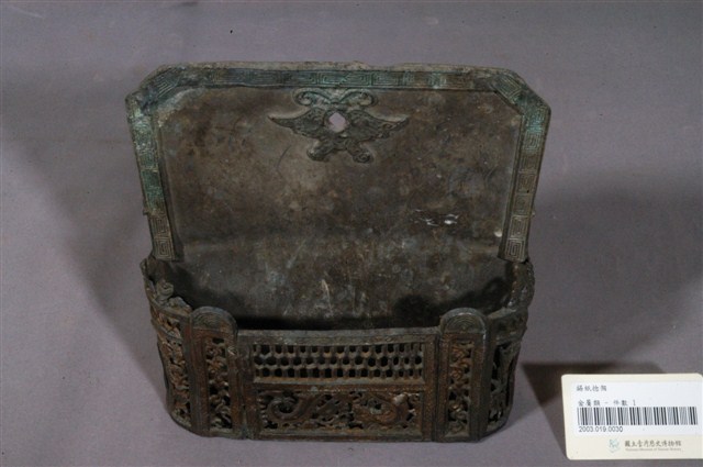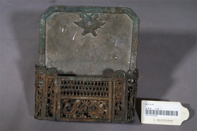 本物件為錫紙捻架,該紙架為錫製,整體狀況可見有多處刮傷或碰撞痕跡,色澤也不明亮,架內並無物品,前方有些許裝飾。