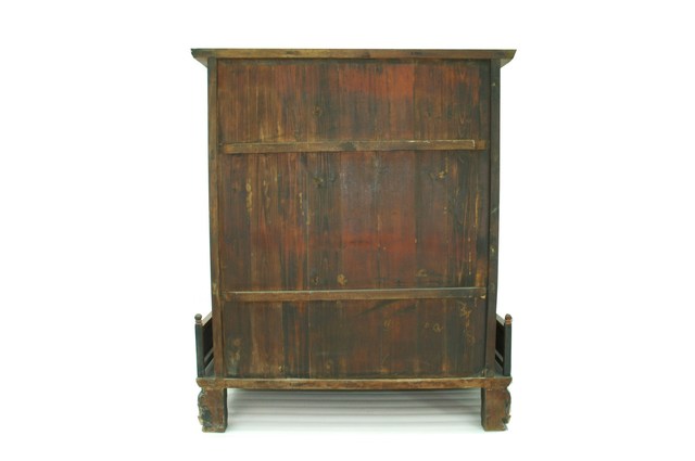 1.本件屬於前者,類似一神龕,整片門扇則以透雕方式分為三層次,最上層為官員及奴婢,兩側以牡丹花紋裝飾,中層為牡丹花紋,下層所占等同門廳,兩側以牡丹花紋作為裝飾。門廳為開放式,內可置祖先姓名及生卒年資料等。雕工精美。2. 臺灣供奉祖先牌位的方式有二,一是神龕式,如同一小型神龕,中央木板寫某姓歷代祖先牌位,左下方題「陽世子孫奉祀」。背面可打開,有一片片小木牌,寫祖妣名諱、生辰、忌日等。立碑式則是一大面木牌,寫歷代祖先名諱,背面可打開,寫祖先名諱,生辰、忌日等。