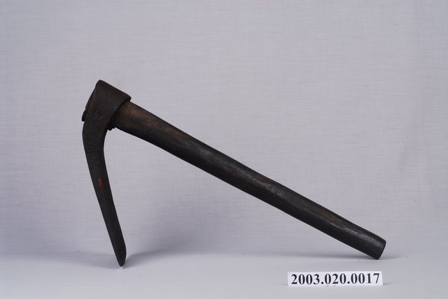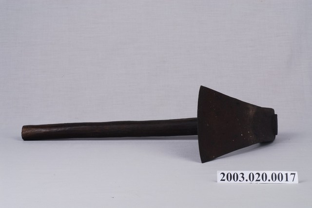 本文物為錛仔,又寫作扳仔,是林場伐木的造材作業時使用,用來修平木材的工具。造材作業是在把樹砍倒後,在現場將樹木去除樹皮並切成方形角材,減輕重量以便搬運。先以斧頭去除樹皮及將木頭砍劈成斷面為四角的平面,再以錛仔修整平面,完成造材作業。本件錛仔為弧形口,刀面與木柄垂直,刀面與木柄角度小,約40度。鐵件後端收為D字形鐵箍供木柄穿過,中間塞以木片、鐵片固定。