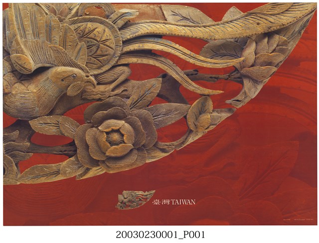 1.本件以鏤空花鳥木雕構件為主題,下方有中英文臺灣字樣的海報。背景色以赭紅色帶淺木紋之設計,以凸顯木雕主題,象徵臺灣傳統意象。2.海報是由文字、造型與色彩所組成,是傳達一個意念整體形象的重要表徵。「臺灣之美」展覽為民國83年由林磐聳擔任「Taiwan Image 臺灣印象海報設計聯誼會」創會會長,在民國83年首度辦理「臺灣之美」的展覽。