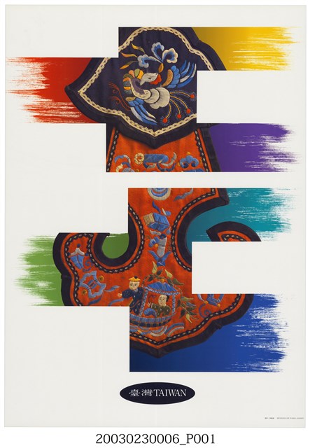 1.本件海報以肚兜的部分圖像呈現,上方以鳳凰,下方以男女乘船圖像表現,透過古老的物件與線條,呈現鳳求凰兮,同船共渡的暗喻。2.海報是由文字、造型與色彩所組成,是傳達一個意念整體形象的重要表徵。「臺灣之美」展覽為民國83年由林磐聳擔任「Taiwan Image 臺灣印象海報設計聯誼會」創會會長,在民國83年首度辦理「臺灣之美」的展覽。