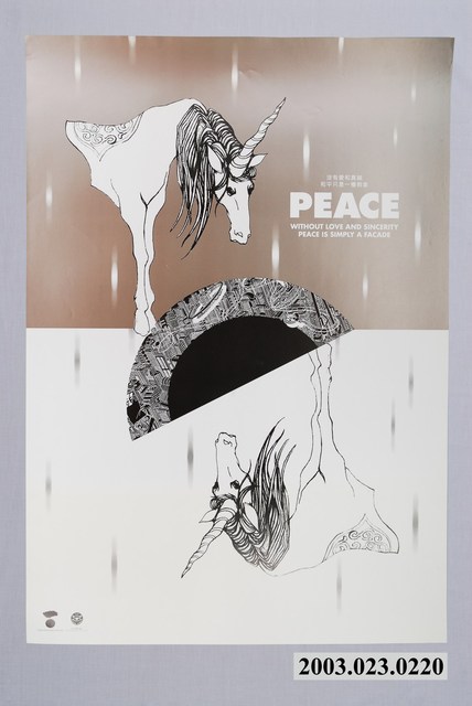 1.本件和平主題海報作品11「愛與真誠」,畫面大致分為上、下兩半,上半以淺褐色為底,下半以乳白色為底,其間帶有條形段對稱紋路,中間有個半圓形,半圓形的圓弧部份一截是黑底的手繪都市圖,圓心部份則為黑色。上、下各有一隻半身獨角馬的對稱畫像。右上方有白字「沒有愛和真誠,和平只是一種假象」及英文「PEACE WITHOUT LOVE AND SINCERITY PEACE IS SIMPLY A FACADE」。