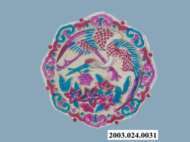本件團鶴彩紙為戰後網版印刷成品,全幅以墨線為基礎,套印藍、紅、洋紅、黃等色,構圖作正圓形,將一隻蜷曲的展翅丹頂鶴置於中間,外圍以三色如意文為邊框。鶴的嘴部刁一朵牡丹,下方有一叢栀子花。本件與登錄號2003.024.0027、2003.024.0032圖案相同。