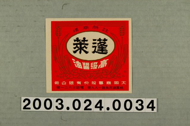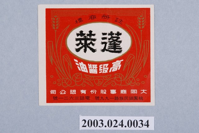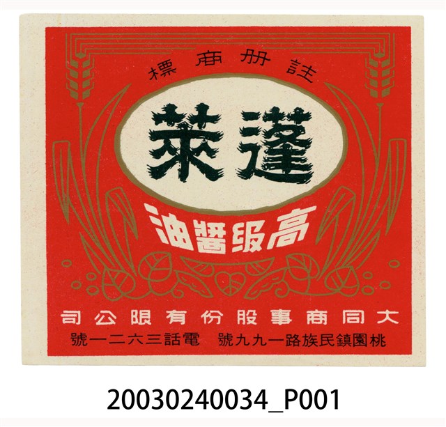 本件醬油商標以彩色套版方式印製,面幅為左右略寬的長方形,底色作大紅色,中央作橢圓形開光,框內白底黑字印製草葉形隸書「蓬萊」二字,為醬油之品名,下方橫書「高級醬油」,週圍圍繞以金色線條所組成的麥穗、葉片圖案,上方橫書金字「註冊商標」。下方兩排文字,上排為白字「大同商事股份有限公司」,下排黑字「桃園鎮民族路一九九號」、「電話三六二一號」。商標最外圍留白邊。大同商事股份有限公司即為金蘭醬油食品股份有限公司的前身。